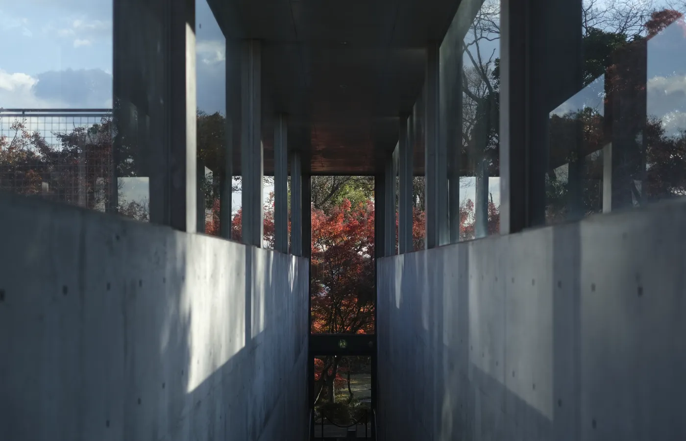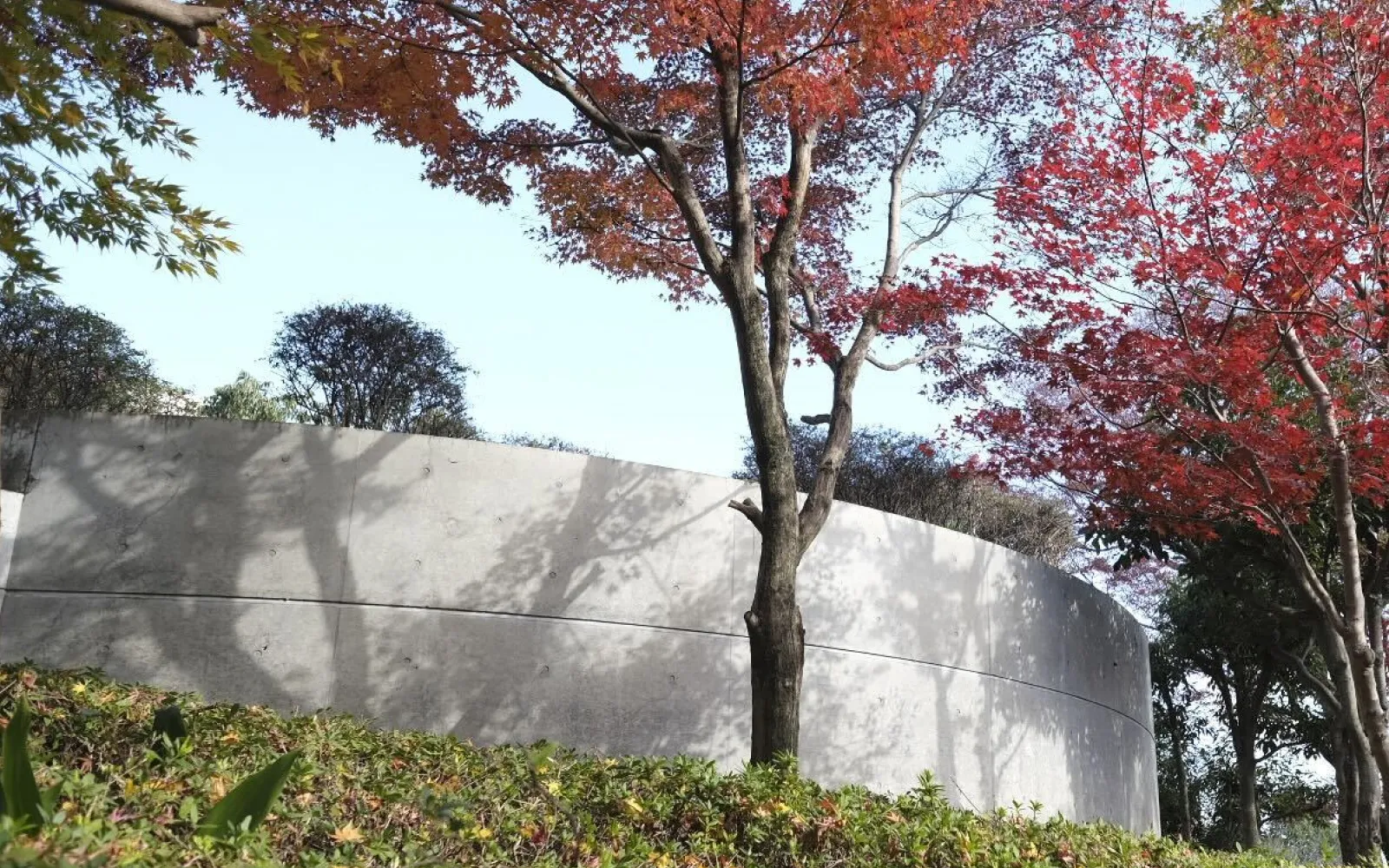 30年前に大山崎山荘を美術館として再生する際に増設されたもので、周囲の自然と調和する半地下構造をもち、円形の展示棟上部には植栽が施されています。展示室へ至るコンクリート打ち放しの階段通路では上部に設けられたガラス窓には木々の緑が映り、訪れる人々を静かな展示空間へと導きます。