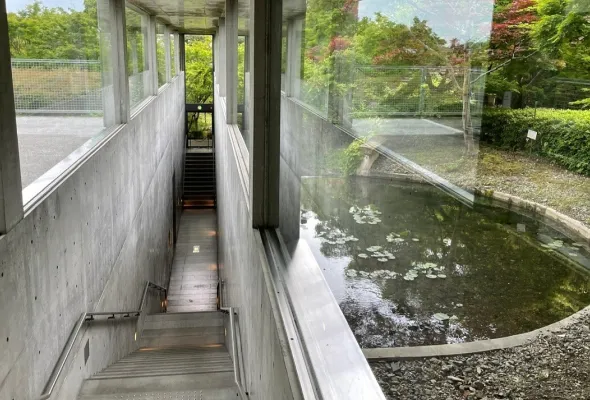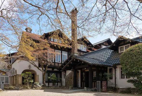 本館は、加賀正太郎が別荘として設計・監修したもので、イギリス遊学中に目にした風景や建物に着想を得て1912年に建設を開始し、1932年頃に現在の姿となったとされています。おもにイギリス風の様式をとっていますが、関東大震災(1923年)以降に建てられた2階建て部分は、鉄筋コンクリート造りです。美術館開館に際し増築された、安藤忠雄設計による「地中の宝石箱」(地中館)は自然との調和を意識した半地下構造で、クロード・モネの《睡蓮》を常設展示。さらに2012年には、温室跡地に「夢の箱」(山手館)が新設され、自然と一体となる建築美を実現しています。